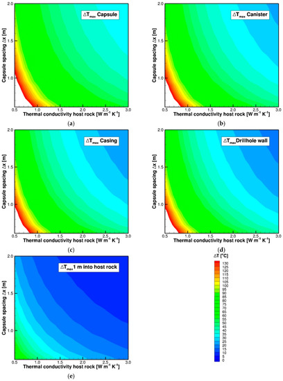 Figure 5 shows two-dimensional response surfaces of the maximum temperature increase at select radial locations as a function of thermal conductivity of the host rock and capsule spacing. Host-rock conductivity is chosen because it is the most influential property that may also vary over a considerable range depending on the rock type and spatial heterogeneity. Capsule spacing is selected as the main design parameter that can be adjusted for effective temperature control.