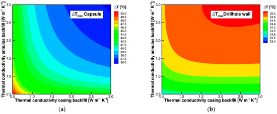 Figure 6 shows the impact of backfill thermal conductivities on the maximum capsule and drillhole wall temperatures. The backfill between the canister and the casing may be a drilling mud, a slurry, sand, bentonite, cement, or another suitable material; the annulus backfill (between the casing and the drillhole wall) is most likely either drilling mud or cement. The lower bound of the thermal conductivity range examined in these response surfaces represents a slurry or accounts for the presence of a fluid-filled gap. Only if backfill conductivities approach these lower bounds does temperature increase slightly relative to the reference case. Note that the temperature ranges in the two response surfaces of Figure 6 are much smaller compared to those shown in Figure 5, confirming the lower influence of these two parameters. For thermal conductivities above about 1.5 W m−1 K−1, the sensitivity of the capsule temperature becomes small and essentially disappears for the drillhole wall temperature. Note that increasing thermal conductivities of the backfill materials leads to faster heat dissipation away from the capsule, thus cooling it down, while speeding up the outward propagation of the heat pulse, thus leading to increased maximum temperatures at the drillhole wall.