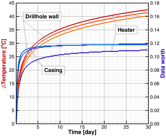 Figure 7 shows the temperature increase and data-worth metric as a function of heating time. The temperature increase exceeds 20 °C after less than 2 days, and reaches 40 °C after 30 days of heating, with only slightly higher temperatures at the heater compared to the drillhole wall. The dimensionless data-worth metric measures the relative reduction in uncertainty of the predicted maximum repository temperatures as data are added. Data worth increases sharply during the initial days of heating. At later times, the data worth, which accounts for parameter correlations and redundancies of closely spaced data points, approaches a constant value. This indicates that the information content of the DTS data initially grows quickly, but is reduced to a constant rate as the heater test is prolonged. Accurately measuring temperatures at early times is most beneficial, with later data providing additional, albeit less important information. The test can be terminated once the acceptable prediction uncertainty is achieved.