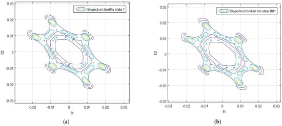 In Figure 3, Figure 4, Figure 5 and Figure 6 we show the differences in the bispectrum between the healthy and the damaged motors, for the different positions at which the measurements of the flux signals were taken. Note that in some graphs there are more substantial differences, such as in Figure 3 as well as in Figure 4c,d. The differences depend on the position in which the measurement was taken, as well as on the load, and on the supply, and will also depend on obtaining a more or less significant difference in relation to the value of the indicator in the frequency domain (Equation (5)).