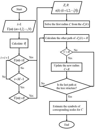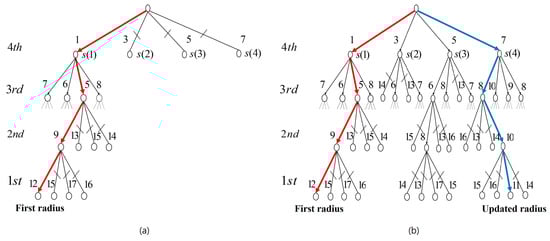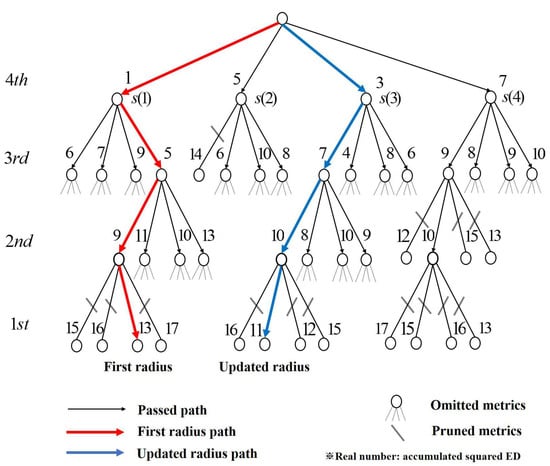 According to Figure 3b and Equation (12), the accumulated squared ED of the updated radius is 11. Finally, the path of the updated radius includes the reference symbols of corresponding nodes.