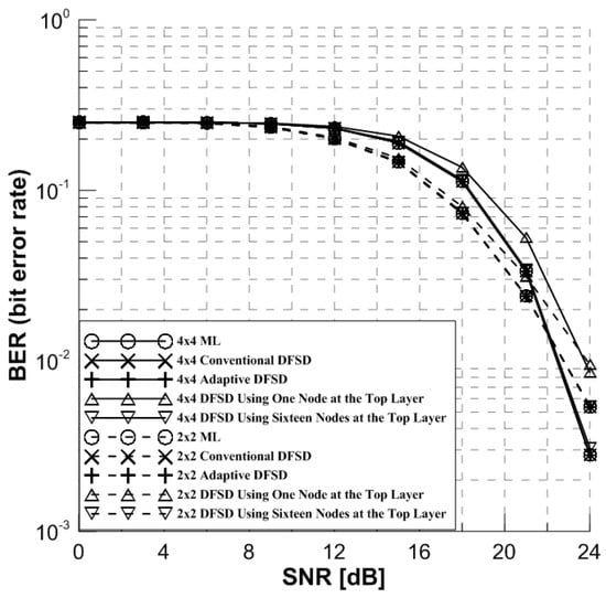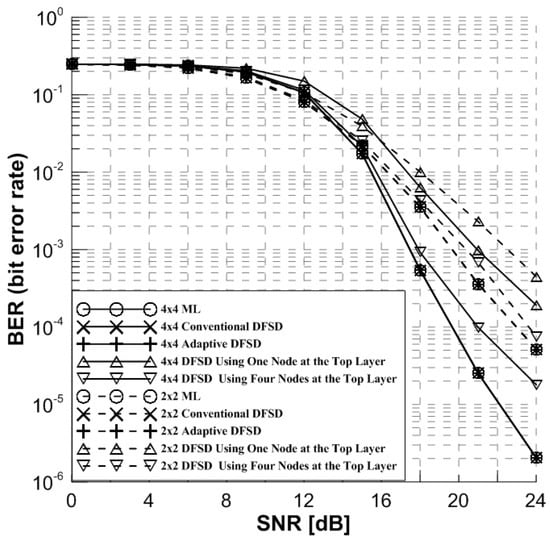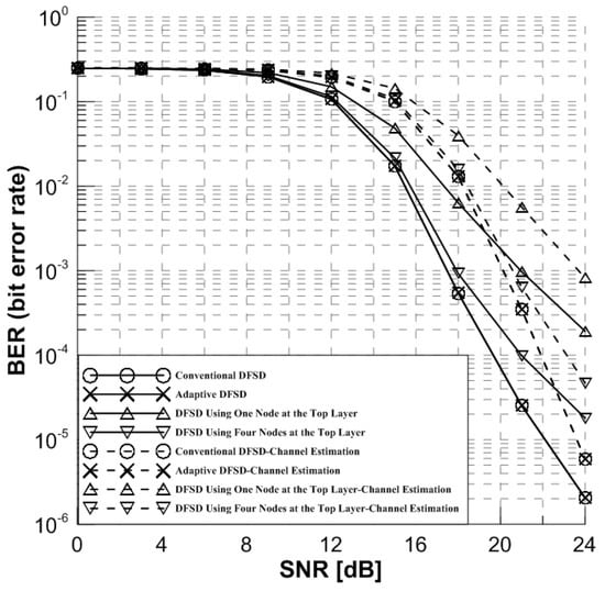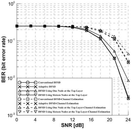 Additionally, Figure 6 shows the DFSD detection schemes using one and four nodes at the -th layer. Also, Figure 7 shows the DFSD detection schemes using one and sixteen nodes at the -th layer. These detection schemes have a worse error performance. Especially, the DFSD detection scheme using one node at the -th layer has the worst error performance among the DFSD detection schemes. So, the proposed detection scheme uses the DFSD detection scheme using one node at the -th layer when the channel has the best condition. On the other hand, when the channel has the worst condition, the conventional DFSD detection scheme is used. It means that all nodes are used at the -th layer for the worst conditioned channel. Through this process, the proposed DFSD detection scheme adaptively uses the different nodes of the -th layer depending on the channel condition.