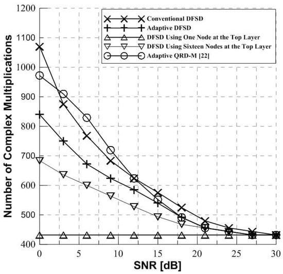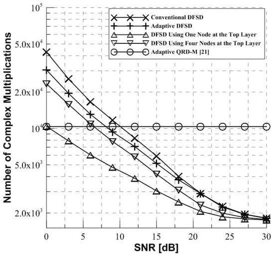It is shown in Figure 10 and Figure 11 that the DFSD detection schemes have lower complexity as the SNR increases. As the SNR increases, the influence of the noise and the initial radius becomes small, and then the complexity becomes low. Also, it can be generally seen that the proposed detection scheme has lower complexity than the conventional DFSD detection scheme. When the proposed detection scheme compares with the adaptive QRD-M [21], the proposed detection scheme has high complexity compared to the adaptive QRD-M [21] at less than 8dB of SNR. On the other hand, the proposed detection scheme has low complexity compared to the adaptive QRD-M [21] at more than 8dB of SNR. Because the adaptive QRD-M [21] has the fixed complexity. Although the proposed detection scheme has high complexity than the adaptive QRD-M [21] at low SNR, the proposed detection scheme has lower complexity than the conventional DFSD detection scheme at low SNR and lower complexity than the adaptive QRD-M [21] detection scheme at high SNR.