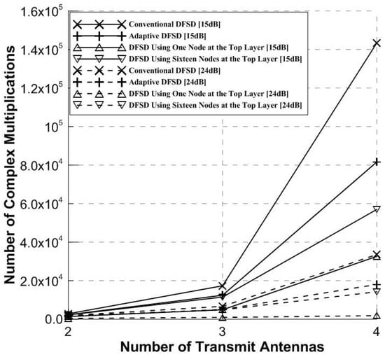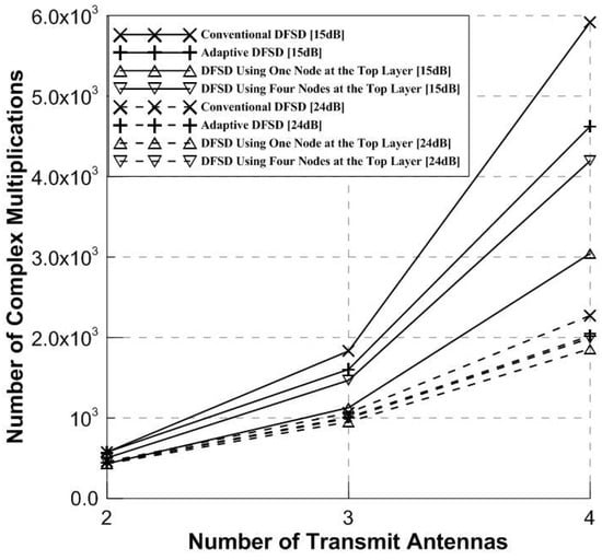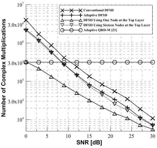 According to the Figure 3, Equations (11) and (12), the DFSD detection scheme using all nodes at the -th layer detects the signal more accurately than the DFSD detection scheme using one node at the -th layer. However, the DFSD detection scheme using all nodes at the -th layer passes through more nodes than the DFSD detection scheme using one node at the -th layer. So, when the channel has the best condition, the proposed detection scheme uses one node at the -th layer. On the other hand, when the channel has the worst condition, the proposed detection scheme uses all nodes at the -th layer.
