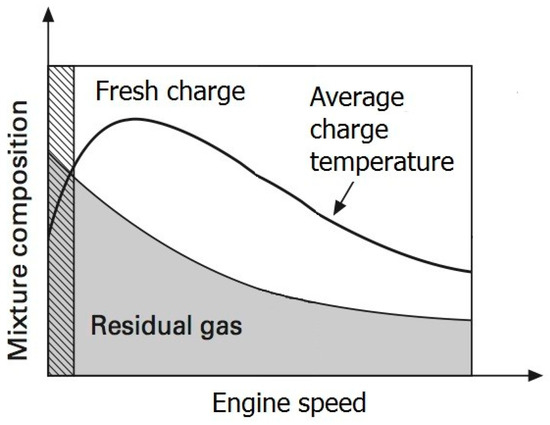 Variation of average charge temperature at the start of compression (Tepc), quantity of fresh charge and residual gas against engine speed in a typical two-stroke cycle engine [25].