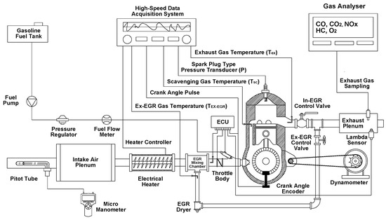With reference to Figure 2, several K-type thermocouples (±1 °C accuracy) are fitted at strategic locations to measure for Tex, Tin and Tsc, (engine exhaust gas temperature, intake gas temperature and transfer port gas temperature). One piezoelectric pressure transducer (KISTLER 6117B) is used, in replacement of the engine spark plug, to record for combustion pressure history. The engine crankshaft is coupled to one crank angle encoder (KISTLER 2613B) to measure for engine crank angle rotation (CAD) with 0.2 Degree of resolution. A high-speed data acquisition system (DEWE5000), equipped with software (DEWESoft and DEWECa), is used for data logging. The engine is connected to an eddy-current brake dynamometer (30 kW MAGTROL) via chain and sprockets. Engine fuel consumption is measured using an on-line type fuel flow sensor (ONO SOKKI FP-2240HA). As for engine emission, one portable exhaust gas analyser (EMS 5002) is employed to induce a minute concentration of the HC, CO2 NOx, O2 and CO2. Gasoline 95 (octane rating 95) is used throughout the entire of experimental program.