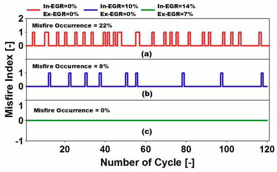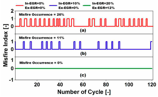 Influence of In-exhaust gas recirculation (EGR) and Ex-EGR on misfire occurrence at Idling condition (rpm = 1000, IMEP = 1 bar, Tepc = 420 K, AFR = 15).