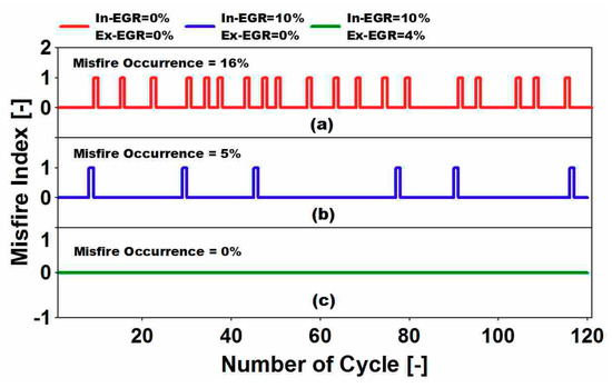 Similarly, the misfire phenomenon can be reduced with the combinational EGRs settings at this engine speed. Almost 16% of the misfire occurrence (19 misfired cycles) is observed when there is no In-EGR and Ex-EGR, as can be seen in Figure 5 marking (a). Similarly the misfire occurrence is reduced significantly by 5% (6 misfire cycles) when 10% of In-EGR is applied. Finally with reference to Figure 5 marking (c), when both In-EGR and Ex-EGR are applied (at 10% and 4% respectively), the misfire occurrence is totally eliminated. In the meantime, it can be seen that the Tepc is now 451 K, which is high enough to assist in the elimination of misfire occurrence.