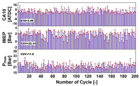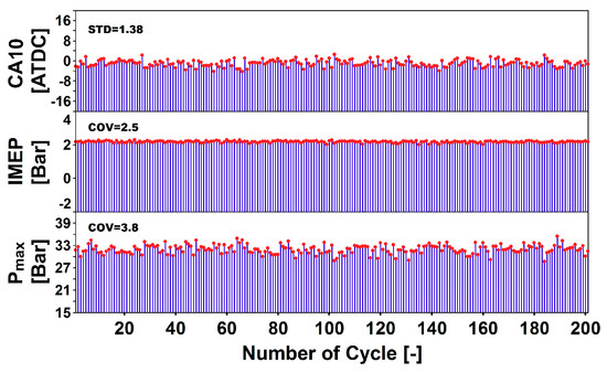 In order to evaluate statistically the cyclic variation of the engine combustion, parameters such as Coefficient of variation (COV) and Standard Deviation (STD) are used. Here, in-cylinder combustion IMEP and maximum in-cylinder pressure (Pmax) which are pressure-related parameters, together with CA10 (crank angle at 10% of mass fraction burned) which is a combustion-related parameter; are taken into consideration in an effort to examine the combustion stability when the EGRs are applied. All data recorded for 200 consecutive cycles, which is sufficient to provide a steady state condition for the engine during trial.