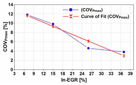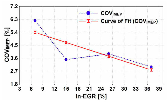 For this part of experiment, the cyclic variation of Pmax, CA10 and IMEP are examined in relation to In-EGR and Ex-EGR changes at 3000 rpm (mid-load), based on the operating conditions as explained in Table 3. As can be seen in Figure 8 and Figure 9 the utilization of In-EGR and Ex-EGR improves the cyclic variation of Pmax (COVPmax) meaning that when the percentage of In-EGR and Ex-EGR increases the COVPmax will decrease accordingly. Therefore, it can be deduced that cyclic variation of Pmax is inversely proportional to the concentration of both In-EGR and Ex-EGR. Furthermore, it should be noted that Pmax is more influenced by In-EGR changes since in the case of In-EGR the slope ratio for curve of fit in both Figure 8 and Figure 9 are more than that of Ex-EGR. The reason for this trend can be explained as: In the case of In-EGR the most dominant effect is the charge heating effect wherein both pressure and temperature at the exhaust port closure (Pepc, Tepc) will increase since the percentage of In-EGR is raised therefore it establishes a complete cycle of combustion. Furthermore, owing to the impact of the charge heating effect and the contraction of the exhaust port area by the In-EGR valve, Pepc will increase tremendously. Consequently, Tepc and heat release rate will be increased. In Ex-EGR, the most dominant effects are those of thermal and dilution effects. Utilizing Ex-EGR increases the specific heat capacity of the in-cylinder charge. However, the Tepc is increased slightly, the mixture takes more time to heat up. Additionally, the overall reaction rate of combustion will be suppressed due to substitute of CO2 and H2O instead of O2 (dilution effect) [3,6].