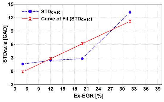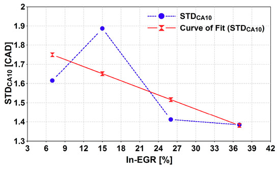 Figure 10 and Figure 11 represent the cyclic variability of CA10 (STDCA10) with respect to In-EGR and Ex-EGR variations. As illustrated in Figure 10, STDCA10 decreases when In-EGR rate increases. In contrast, STDCA10 is increased when Ex-EGR increases. Even though In-EGR improves the cyclic variability of CA10, Ex-EGR seems to deteriorate it. Correspondingly, it is thought that STDCA10 is directly proportional with percentage of Ex-EGR while it is inversely proportional with the percentage of In-EGR. Furthermore, the STDCA10 is more sensitive to Ex-EGR changes rather than In-EGR, as it can be clearly interpreted from the slope ratio of the curves of fit in Figure 10 and Figure 11.