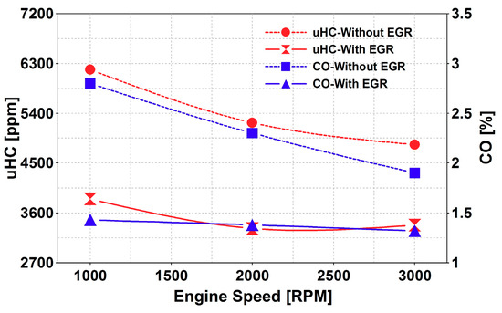 Figure 14 represents the variation of uHC and CO emissions against engine speed before and after EGR application. The concentration of both uHC and CO is lowered when EGR applied. From the trend shown it can be interpreted that rate of variations in uHC and CO concentration decrease with the increased in speed. However, engine speed does not impair significantly on the emission concentration of CO when the EGRs are applied. As discussed earlier, since the incomplete combustion cycles (i.e., misfire cycle) are eliminated, due to the using of In/Ex-EGR, the exhaust constituents such as uHC and CO are subjected to change. Having an improved combustion (completed combustion) will result in lower concentration of uHC and CO.