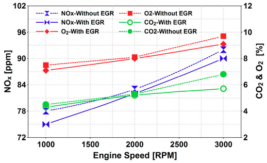 Figure 15 presents the variation of NOX, CO2 and O2 emissions against the speed before and after EGR is applied. From the results the concentrations of NOX, CO2 and O2 decrease for all three speeds, however the improvements do not follow the trend as observed earlier for uHC and CO. From the of exhaust emission the EGR application for this type of engine at idling, low-load and mid-load regions mainly affect the reduction in the concentration of uHC and CO, more than that of NOX, CO2 and O2.