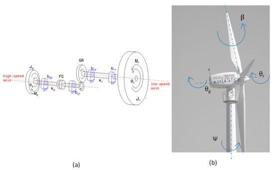 As for the drive train, the main axes are the slow axis or the rotor axis (θr), and the fast axis or the generator axis (θg). Figure 1a represents the mechanical elements of the power system: rotor, multiplier (GR), flexible coupling (FC), and generator. The slow and fast axes are supported by their corresponding bearings. The slow shaft is supported by the bearings br1 and br2, which are characterized by a specific damping coefficient [N·m·s/rad], and the fast shaft by bg1 and bg2. The stiffness values of the slow and the fast axes of the rotor are defined as kr and kg [N·m/rad], respectively.