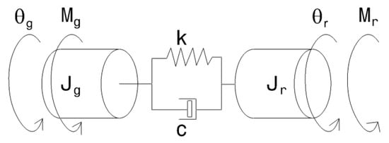 Since the arrangement of the bodies and joints is a chain of transmission in series as shown in Figure 1a, the equivalent rigidity k [N·m/rad] of the system is defined by Equation (2), considering the rigidity of the rotor kr and the generator kg: