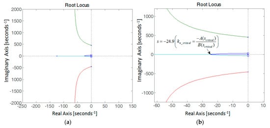 The root locus of Figure 3a shows that the obtained system is stable with complex and real roots, therefore, it could have more than one resonance frequency. A zoom-in of the most interesting zone of the root locus is shown in Figure 3b, where it is possible to see that the breakpoint is located at s = −24.9 (so scritical = −24.9), and by substituting that value into Equation (13), the linearization gain value kn_critical for that critical point is determined. The next step is to calculate kt using the values of the parameters of Table 2 in Equation (5). Finally, with the obtained values of kt and kn_critical, the value of ωg_critical is calculated as indicated in Equation (14), giving a critical rotational velocity of ωg_critical = 566.72 rpm.