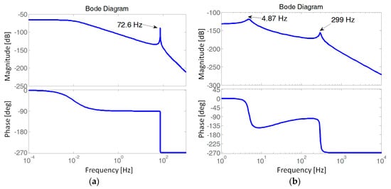 Bode diagram of the mechatronic model of the power chain of the 100-kW wind turbine. (a) Case of one resonance peak, when ωg = 502 rpm, (b) Case of two resonance peaks, when ωg = 650 rpm.