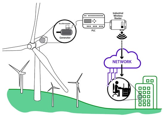 In order to experimentally validate the mechatronic model and perform an optimum frequency analysis, an accelerometer was placed in the transmission chain of the wind turbine of Figure 5, specifically in the generator as indicated in Figure 6. The spectral signals collected by the accelerometer were gathered by a Programmable Logic Device (PLC) and, by means of a wireless industrial router, the signals were sent to the company Argolabe S.L. Engineering Company to be analyzed, as indicated by the pipeline of Figure 6.