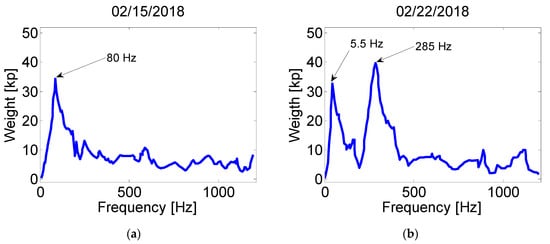For 30 days the vibratory signals were registered. Frequency analysis, similar to that represented in Figure 4, was completed and the results are shown in Figure 7. These frequency response signals (FRF-s) were sampled by a frequency analyzer that gathered data blocks of 5 s with a 2 kHz sampling time, storing 10,000 samples during the 5 s. One such block was taken every 10 s, so there were 5 s between two consecutive blocks. The frequency signals of Figure 7a and Figure 7b represent the magnitude of weight [kp] versus frequency [Hz] of the sampled measurements, taken in real time during different days.