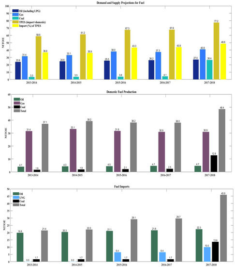 Domestic use, as well as imports of these conventional sources, has put a massive burden on the economy of the country and also caused environmental and health issues. Pakistan has a tremendous wind energy potential available in Sindh and Baluchistan. There is a terrible need for the country to move towards renewable energies like hydro, wind, solar and bioenergy. The Ministry of Planning, Development, and Reforms in Pakistan has taken the initiative under the 11th five-year plan, in which energy crisis is cogitated, and strategies to meet the energy demands of Pakistan have been proposed [1]. Figure 2 shows the demand and supply projections for fuel from 2013 to 2018. Oil (including LPG), gas, coal, total primary energy supply (TPES) and imports as the percentage of TPES resulted in a million tons of oil equivalent (MTOE). In 2017–2018 total domestic fuel produced by Pakistan in MTOE was about 48.43 and fuel imports of 45.87 MTOE. As compared to the previous year 2016–2017, the domestic fuel production increased only 10.45%. Figure 3 shows the per annum demand for power (MW) by NTDC and KESC. During the period of 2017–2018, power demand by National Transmission and Dispatch Company (NTDC) and Karachi Electric Supply Company (KESC) was 26.53 GW and 4.5 GW, respectively.