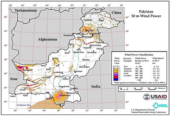 Pakistan wind electric potential, good to excellent wind recourses at 50 m.