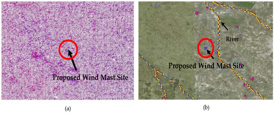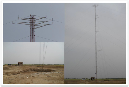 Wind mast and its surroundings at proposed site. (Right side of figure).The complete structure of wind mast, used for collecting wind data, (top left) microscopic view of tower top, (bottom Left) Microscopic view of tower ground.