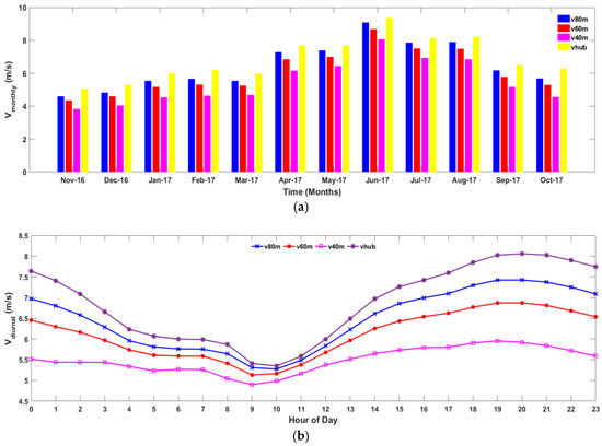 Wind speed at 80 m, 60 m, 40 m and Vhub heights for Sanghar site. (a) Monthly average and (b) Daily diurnal.