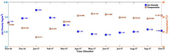 The use of standard (constant) air density i.e., 1.255 kg/m3 for the analysis can cause the variation of wind power density results [27]. When the wind power density is calculated using the air pressure and temperature data of candidature site, the results are slightly different. Therefore, it is better to use air density data of the selected site instead of a standard value for air density [56,57]. Whereas in this research work, authors have utilized the 10 min average actual data of temperature and air pressure of selected site to evaluate the 10 min average air density. Moreover, the calculated 10 min average air density values were utilized to calculate the 10 min average wind power density. Finally, the monthly and yearly average wind power densities were calculated to ensure the accuracy in results. Hence, Figure 8 shows the monthly average air density and temperature.
