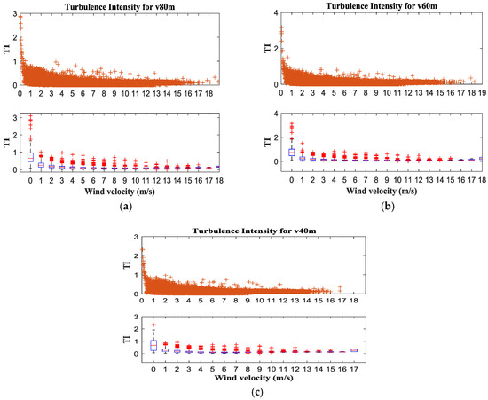 Turbulence intensities for velocities at different heights (a) 80 m (b) 60 m and (c) 40 m.