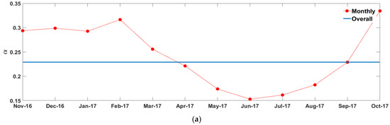 The monthly mean wind shear exponent (∝) and shear profile of this site are shown in Figure 11a,b respectively. The wind shear exponent (∝) of the power law model is analyzed for atmospheric boundary layer. It is estimated by using regression analysis using 10 min average data of wind speed sensors at heights of 80 m 60 m, and 40 m for one-year data from Nov-2016 to Oct- 2017. Alpha (∝) keeps on varying with time of the year, and its value is dependent on the site. The overall average of alpha (∝) for Sanghar is 0.229. The minimum wind shear exponent (∝) observed is 0.1528 in the month of June and maximum wind shear exponent (∝) observed is 0.3344 in the month of October.