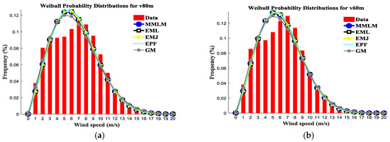 Moreover, the lowest values were observed in April, May, June, July, August, and September. In the shear profile, the wind velocities of all sensors at heights of 80 m, 60 m, and 40 m were fitted to estimate hub height velocity at 100 m. This is estimated to be 6.75 m/s as shown in Figure 12. The comparison among five Weibull methods fitting over wind speed data at each height including Vhub is shown in Figure 13. For wind speed distribution at heights of 80 m and 60 m, it can be observed that all methods fitted appropriately; however, the Graphical Method (GM) showed poor performance over the measured data. At the 40 m height, GM and MMLM almost fit the data, but EMJ, EML, and EPF have slightly differences in fitting, so MMLM is considered as the finest method for estimating wind power potential at this site. Moreover, details on the monthly and overall values of mean wind speed, shape , scale , wind power density and energy obtained by using MMLM method is shown in Table 3, where the estimated monthly mean and yearly values of wind speed, shape , scale , wind power density (W/m2) and energy density (kWh/m2) at different heights are shown. These parameters are obtained using the MMLE method for a Weibull distribution. A one-year period of data is analyzed. At hub height (100 m), the maximum mean wind speed is 9.35 m/s in June, shape parameter is 3.40 in September, scale parameter is 10.42 in June, wind power density (kW/m2) is 624.71 in June and energy density (kWh/m2) is 449.79 also in June. The overall yearly averages are 6.85 m/s, 2.46, 7.69 m/s, 323.93 (kW/m2) and 2.837 (MWh/m2). It is observed for all heights that the lowest wind characteristics occur in the month of November and highest in June.