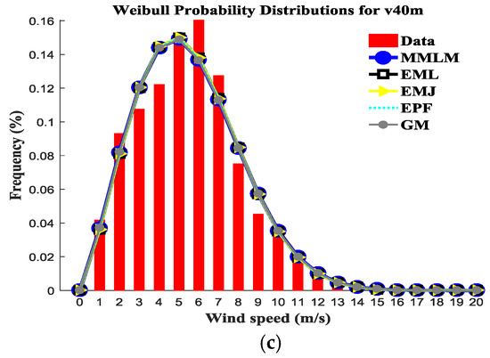 Comparison of placing the five different methods of Weibull probability distributions to measured data for Sanghar site (a) at 80 m height (b) at 60 m height and (c) at 40 m height.