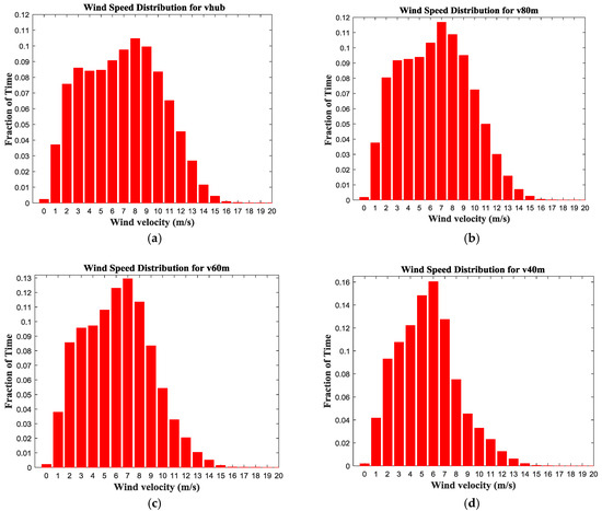 Wind speed distributions for Sanghar site (a) at vhub extrapolated height (b) at 80 m height (c) at 60 m height and (d) at 40 m height.