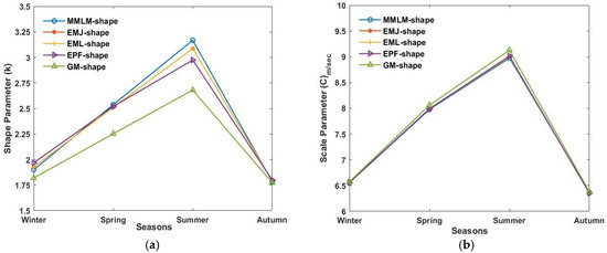 Seasonal average values of (a) the shape (k) and (b) scale (c) parameters calculated using the MMLM, EMJ, EML, EPF and GM methods.