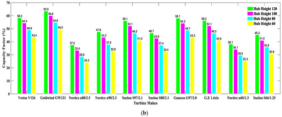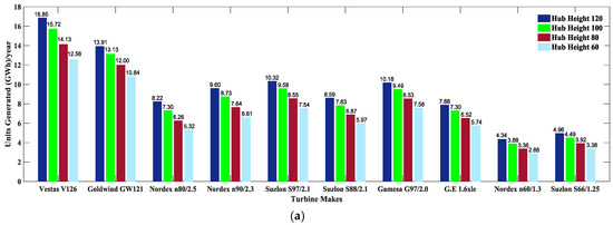 The average energy generated in GWh/year by ten different turbines at four hub heights is estimated and shown in Figure 15a. The detail of wind turbine models with their characteristics is provided in Table 4. The performance of Vestas V126/3300 and Goldwind GW121/2500 outperformed the rest of turbine models at four hub heights (120 m, 100 m, 80 m, and 60 m). The estimated units generated (GWh/year) by Vestas V126/3300 and Goldwind GW121/2500 at four hub heights are 16.85 m, 15.72 m, 14.13 m, 12.56 m and 13.91 m, 13.13 m, 12 m, and 10.84 m respectively.