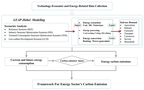 In view of the complexity of the energy system and its complex relationship with socio-economic factors, this study adopts the LEAP model (hereafter referred to as the LEAP-Hebei model), a technology-based, bottom-up approach, to develop a systematic analysis of the current and future energy consumption and its associated carbon emission in Hebei Province. The model framework used to assess the carbon emissions of the energy sector are shown in Figure 2.