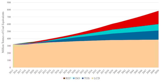 Based on the assumption about the socio-economic development in Hebei Province and the various parameters presented in Table 1 and Table 2 and Tables S1–S3, the values of the total energy consumption for the LEAP-Hebei model for the REF, ISO, TOS, and LCD from 2015 to 2050 are shown in Figure 3. In general, the energy consumption rose steadily before 2050 in each scenario, whereas the growth rate was different. The total energy consumption maintained a high-speed growth trend in the REF, ISO and TOS, and even though the LCD also showed an upward trend, the growth rate was slow. The energy consumption increased from 321.61 Mtce in 2015 to 784.88 Mtce in 2050 in the REF, with an average annual growth rate of 2.58%, the highest among the four scenarios. Due to the industrial structure optimization measures, the total energy consumption will be reduced to 601.3 Mtce in 2050 in the ISO, a decrease of 183.55 Mtce compared with the REF, with an average annual growth rate of 1.81%. Due to the implementation of coal cleaning, the development of renewable energy sources, the reduction of the proportion of traditional energy sources, and the improvement of the energy efficiency based on the ISO, the total energy consumption will be reduced to 512.42 Mtce in 2050 in the TOS, a decrease of 88.95 Mtce compared with the ISO, with an average annual growth rate of 1.34%. The LCD, which has a higher level of energy efficiency and of application of renewable energy, had a reduced total energy consumption of 385.92 Mtce, a decrease of 126.5 Mtce compared with the TOS, with an average annual growth rate of 0.52%.