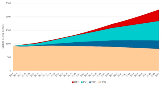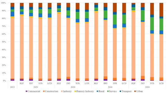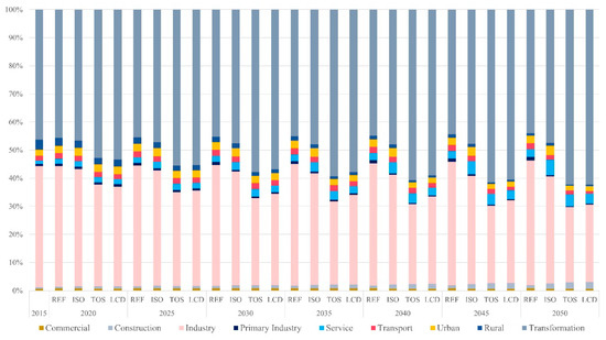 As shown in Figure 4, the majority of terminal energy consumption came from the industrial sector, accounting for 77.78%; the household sector accounted for 10.70%, the transportation sector 3.67%, the agricultural sector 1.79%, the commerce sector 1.91%, the construction sector 1.18% and the service sector 2.96%. The industrial sector will always have a dominant position in energy consumption. With the optimization of the industrial structure, adjustments in the energy structure, the development of renewable energy sources, the reduction of the proportion of traditional energy sources, the improvement of energy efficiency and introduction of energy policies, the trend changes in the terminal energy consumption structure are obvious. The proportion of energy consumption in the industrial sector will continue to decline, while the proportion of the household and service sector will gradually rise in the ISO, TOS and LCD. In the LCD, the proportion of energy consumption in the industrial sector continued to decline, and it accounted for 52.412%, which was 19.81% lower than the TOS. The proportion of energy consumption in the household and service industries continued to rise; the household sector accounted for 17.95%, an increase of 7.92%, and the service industry accounted for 16.47%, an increase of 13.51% compared with the base year. The proportion of the energy consumption of the construction and commerce sector increased slowly, while that of the agricultural sector declined slightly; that of the transportation industry first rose and then slowly declined.