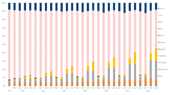 The structural changes in the final energy usage are shown in Figure 5 in the four scenarios in 2020, 2030, 2040 and 2050. The structure of the REF energy usage is basically the same as that of 2015, with coal, fuel oil, natural gas and electricity accounting for 86.67%, 8.13%, 2.99% and 2.60%, respectively. Coal will still dominate the energy consumption system by 2050 under the REF. Under the change of energy policy, the proportion of different fuel types would vary greatly in the four scenarios. In contrast, by 2050, coal decreased to 72.10%, coke decreased to 19.82%, natural gas rose to 4.42% and electricity rose to 7.48% in the ISO; coal decreased to 51.81%, natural gas rose to 9.92% and electricity rose to 15.57% in the TOS; and coal decreased to 36.23%, natural gas rose to 8.92% and electricity rose to 19.82% in the TOS. Obviously, the proportion of coal consumption is continuously decreasing, while the proportion of electricity and natural gas is continuously increasing under the various policy changes. In addition, the range of increase in LPG, CNG, wind energy, solar energy, water energy and biomass energy is different, whereas diesel and gasoline are significantly reduced. This is mainly due to the implementation of clean energy, the promotion of new energy usage in the transportation sector, and the expansion of the proportion of renewable energy in power generation. Under the TOS and LCD, the energy use structure will gradually become environmentally friendly, and clean energy will grow rapidly, which provides positive policy recommendations for Hebei’s low-carbon development and emission reduction.