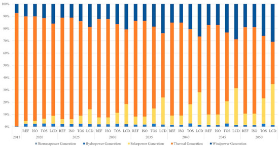With the development of the social economy, the demand for electricity continues to rise. In the REF and ISO, the proportion of various types of power generation is still dominated by thermal power generation, and the thermal generation accounts for over 70%. In the TOS and LCD, the proportion of renewable energy generation is continuously increased to 50.78% and the proportion of thermal power generation is reduced to 34.34% by 2050, while the proportion of renewable energy power generation will increase to 49.22% and 65.66% by then. The advanced IGCC and CCS technologies will be introduced into thermal power generation to improve the efficiency of power generation and reduce carbon emissions. The specific proportion of electricity generation is shown in Figure 6 in the four scenarios from 2015 to 2050. The proportion of thermal power generation has been decreasing, and that of renewable energy has been increasing. Taking the LCD as an example, the proportion of thermal power generation has decreased to 34.34%, while renewable energy generation includes wind power (30.92%), solar energy (33.42%), hydropower (1.25%) and biomass energy (0.07%). The proportion of renewable energy generation increased by approximately 57.60% compared with the base year. This is accomplished by combining the geographical advantages of Hebei in the use of wind and solar energy technology to increase the power generation of clean energy and reduce CO2 emissions by 2050.