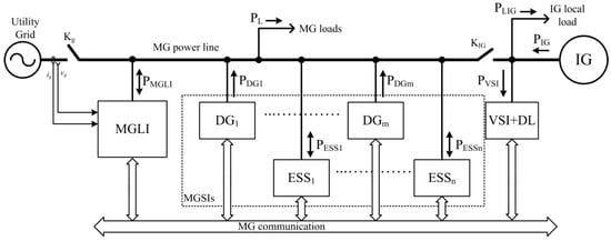 In the proposed scheme, the IG can operate by itself supplying the local load, and it can seamlessly connect to the MG when necessary. By this approach, the IG forms a separate section of the MG, separated by the main grid through the IG relay KG, controlled by the IG control system as described in Section 2.2. The concept of sectionalizing MGs has been previously discussed in the literature [24,25] and it has shown that, although the complexity of the system increases, the system’s reliability and security of supply can be greatly improved. Moreover, the direct connection of the IG provides a natural inertia to the system, which is exploited here to increase the stability of the MG dominated by inverter-based sources.