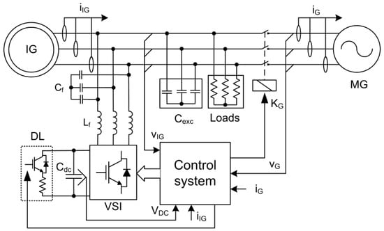 Regarding autonomous MGs interaction with the grid, the literature is comprehensive, a particular category being inertia-less MGs [18,19]. But in which concerns the case of autonomous IG systems the literature lacks studies regarding their synchronization with the grid and even less with an MG. For example, the authors of [20] investigate a wind-solar-diesel MG in which the IG is powered by a diesel engine (DE) and can operate in parallel with a permanent magnet brushless DC generator driven by a small wind turbine and a PV array, the control being performed by a VSC in combination with a battery storage system. The MG can be connected to the grid, thus enabling bidirectional power flow, but in this case, the IG-DE unit is disconnected; it only synchronizes with the MG when the latter operates in autonomous mode and the available renewable energy cannot sustain the local loads. Another similar approach is presented in [21], case in which a wind-driven IG, controlled by an active voltage and frequency regulator (actually a voltage source inverter (VSI) with a controllable resistor on the DC link), is investigated when being paralleled/disconnected with/from the power grid.