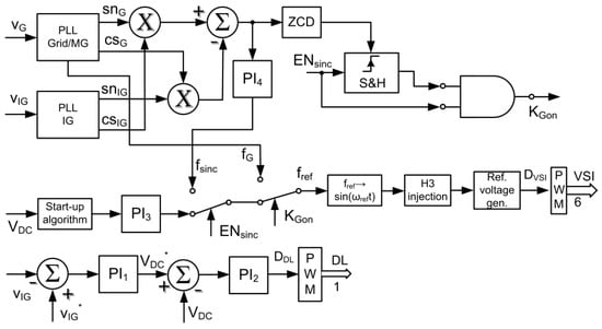 The IG system control structure is presented in Figure 3. It consists in three loops responsible for providing (from top to bottom): the synchronisation signal for the KG switch, the 6 pulse-width-modulation (PWM) pulses for the VSI and the DL PWM signal respectively.