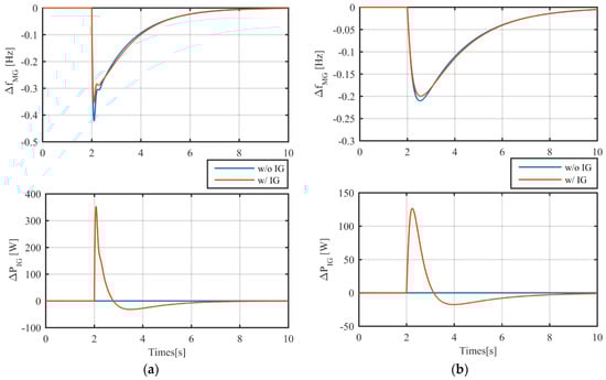 MG frequency deviation (ΔfMG) and IG output power deviation (ΔPIG) for a 2 kW load connection, without and with IG connected: (a) HVSG = 1 s; (b) HVSG = 10 s.