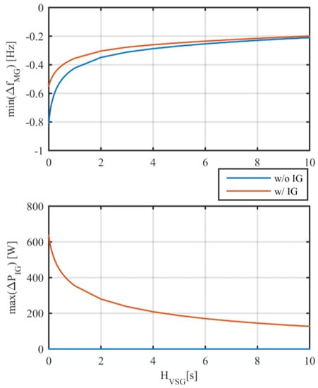 Figure 4 shows how the IG can influence the MG frequency response for a 2kW load connection, with the MGLI emulating an inertia constant of HVSG = 1 s and HVSG = 10 s. Due to its natural inertia, the IG has a positive impact on the MG frequency response, the maximum frequency deviation being slightly reduced in both cases. As it can be seen, at low MG inertia (i.e., HVSG = 1 s) the IG response is more significant than in the second case with high MG inertia. Moreover, the IG support is more pronounced in the case of very low inertia, as shown in Figure 5. An important point worth noting is that, in the analysed case, only the natural IG response is exploited. However, further improvements are expected if the VSI integrated to control the IG during autonomous operation (i.e., KG is opened) is used to boost the IG natural response (this subject is reserved for future research).