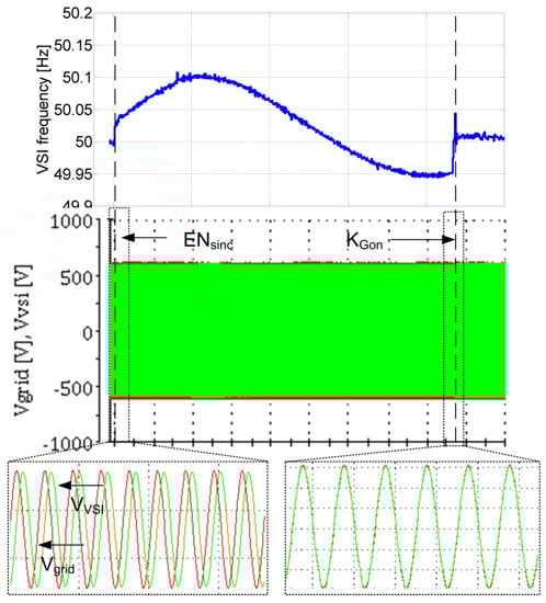 The situation in which the IG system is connected to the inverter-based MG is investigated first. Thus, as the VSI receives the synchronization signal, it starts changing the frequency of its output voltage (VVSI) in order to bring its voltage in phase with the MG one (Vgrid), as in normal operation they are likely to be out of phase. When the two voltages do match, the signal for the KG switch is activated, thus enabling a seamless transfer of the IG system from autonomous to MG connected mode, as shown in Figure 7. In the upper part of Figure 7 the VSI frequency variation is shown, while at the bottom are highlighted the phase of the two voltages when the synchronization process was enabled (left side), and during the KG switch closing (right side).