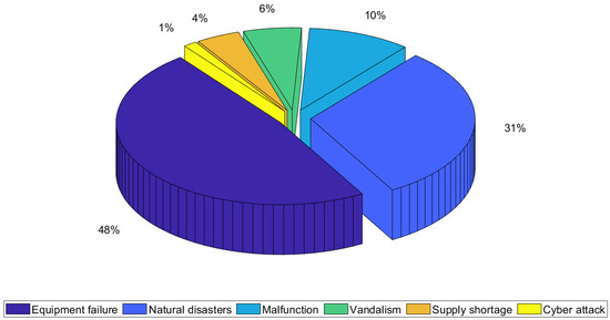 Figure 5 depicts the normal operating conditions of a distribution network, where the grid is not subjected to unusual events. Nevertheless, any failure in a distribution system interferes with the normal system operation, which are commonly caused by insulation failure, flashover, physical damage or human error. Faults on power systems could involve all the phases in a symmetrical manner, or may be asymmetrical where only one or two phases are on short. Nevertheless, open-circuit faults are present on distribution grids due to conductors of primary feeders are broken, or circuit breakers operate only on one or two phases, leaving others connected. The aforementioned kind of fault is usually on extreme events, where sections of the grid can be affected, consequently, power outages affect end customers, producing extensive damage to private and public property, affecting utilities and their infrastructures.