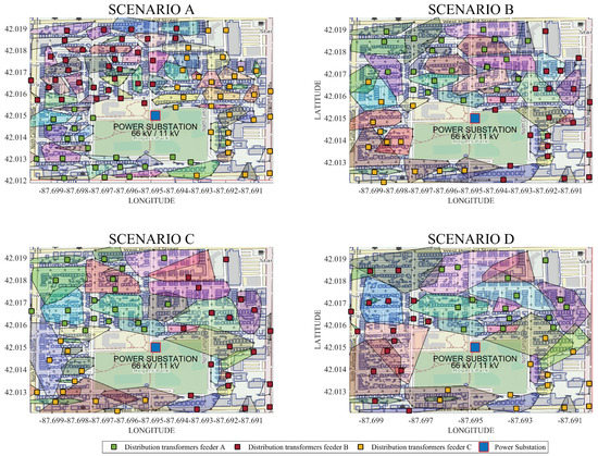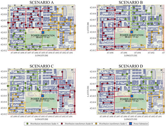 Figure 4 depicts the medium voltage network in each scenario, where the primary feeders connects the totality of distribution transformers. Primary feeders A, B and C are represented by green, red and yellow colours respectively for each scenario. The routing of MV network is based on MST techniques considering the lowest path between distribution transformers and power substation. As can be seen in Table 3, the length of MV network is intensely associated with the amount of distribution transformers, therefore, Scenario A shows the longest MV network, whereas, scenario C and scenario D shows the lowest length of MV grid.