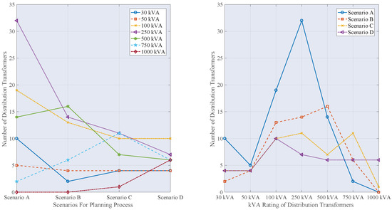 Figure 3 shows the rating capacity of selected distribution transformer by each scenario, where it is clear that the number of transformers employed to feed residential and commercial customers decrease in function of the LV network’s length. Seven different kVA rating has been selected for planning process, the smallest capacity is 30 kVA to supply to reduced number of customers, whilst the bigger transformers has a nominal capacity of 1000 kVA, which are used solely in special conditions where the LV network has an average distance of 400 m. Set in this background, Scenario B and C present the most effective features due to the fact that the LV network has an average length of 200 m and 300 m, respectively. Additionally, 55 and 48 distribution transformers along 3 primary feeders (Scenario B and Scenario C) are needed to supply electricity to end customers, which have mainly a lower capacity than other scenarios; which is a paramount aspect since small transformers are more economical than large distribution transformers.
