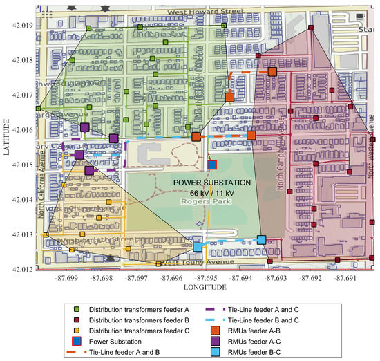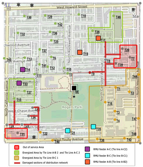 Set in this context, switching equipment has a prominent function during unusual events due to the fact that they sectionalize faulted branches, as can be seen in Figure 6. For the present, it has been supposed an event that induces open-circuit faults on the distribution grid (highlighted in red) can be detected by utility’s monitoring system. The monitoring system has the capacity to order the RMU operation, changing the topology of the distribution network. Subsequently, the feeder topological infrastructure is reconfigured altering the close/open status of tie switching equipment, improving reliability and resilience.